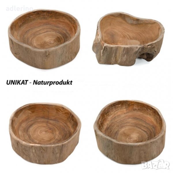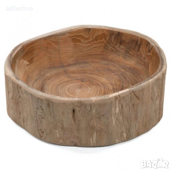 Плътна дървена купа, изработена от красиво структурирана, здрава тикова дървесина, кръгла и полирана.