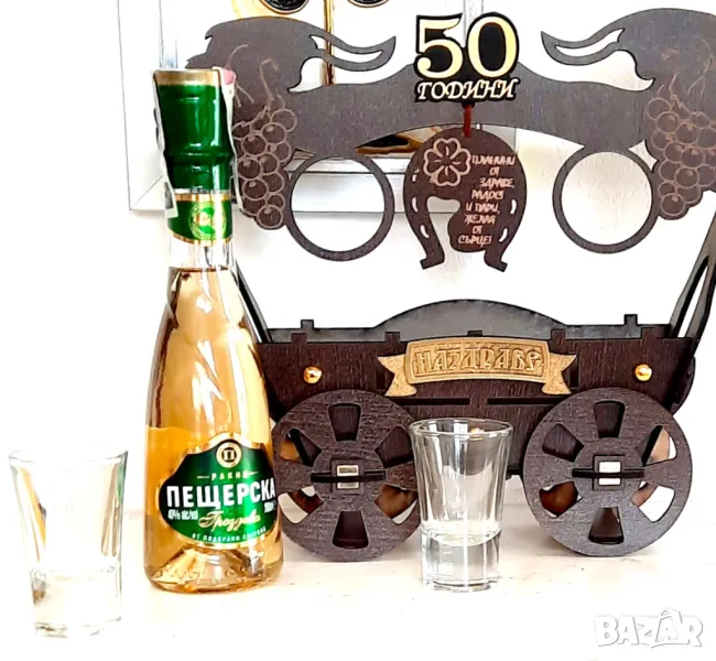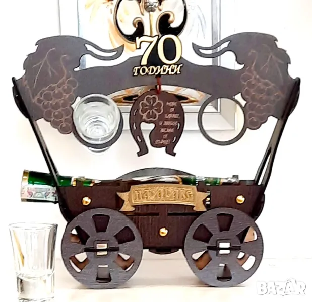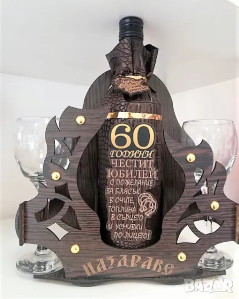 Оригинален подарък за 50, 60 или 70 годишен юбилей -дървена поставка с апликирана бутилка със съдържание с кожа във формата на торбичка и дървена плочка със златни цифри и оригинално пожелание + две стъклени чаши за вино на столче.