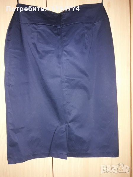 Дължина до коляното - 63 см. Талия едностранно - 42 см, ханш - 52 см. Цвят тъмно син. Българско производство. Полата е нова, но ми е голяма, разделена от костюм.