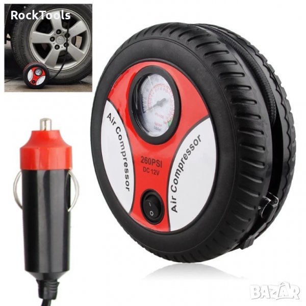 Автомобилен компресор във форма на гума DC 12V 260 PSI - много полезен във всяка кола, а оригиналната визия е интересна идея за перфектен подарък. Ефективният въздушен компресор може да се използва успешно за удобно и бързо напомпване на гуми на автомобили, мотоциклети, велосипеди, мотопеди, топки, играчки и други. Притежава въздушен маркуч с дължина 45 см от спирателния клапан. Оборудван с голям и ясен циферблат. Захранван от запалката на автомобила свързващият кабел може лесно да заобиколи дори голяма кола, достигайки навсякъде. Въздушният маркуч и захранващият кабел могат лесно да бъдат увити около компресора - така че той да не се заплита.