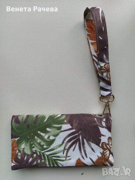 Ръчно изработено портмоне от хидрофобиран плат. Подплатено с вата. Отделения за пари, смартфон,карти и джоб за стотинки с цип. Закопчаване с магнитни копчета. Размери 18/9,5 см,18/19см(в разгънато положение). Дръжка 2 евро