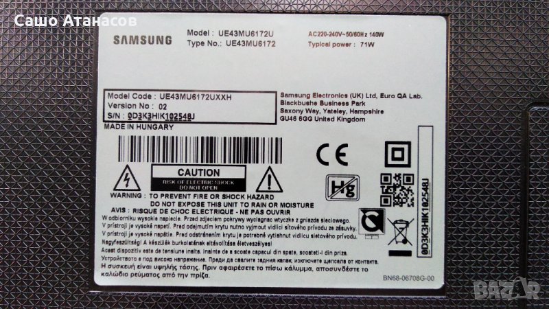 SAMSUNG UE43MU6172U със счупена матрица ,BN44-00806A ,BN41-02568B ,WCM730Q ,CY-GK043HGEV1H