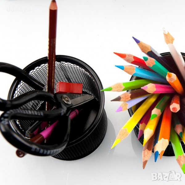 Метален органайзер за бюро. Настолен моливник с тяло от черна мрежа. Поставка за химикали, моливи, маркери, четки за рисуване и други принадлежности. Елегантен и семпъл дизайн пасващ на всеки интериор. Практичен и нужен аксесоар за ученическо бюро или офис бюро.