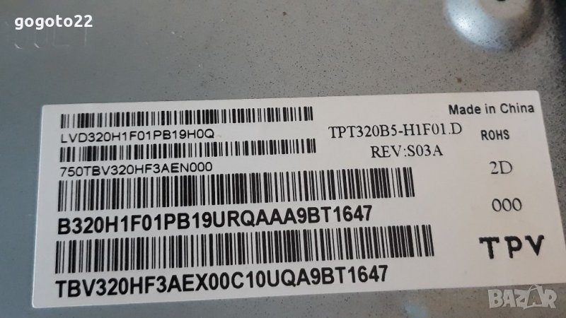 Телевизора е със счупен дисплей всичко останало работи. MAIN board 715G9287-C02-002-004Y цена 60 лева- продаден. Матрица TPT320B5-H1F01.D счупена. Подсветка GJ-2K17 CSP-315 цена 30 лева. T -CON CV320H1-F01XC-2 цена 25 лева. Стойка две крачета комплект цена 20 лева.