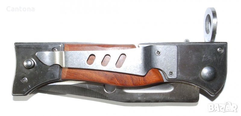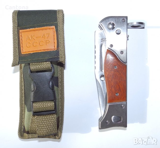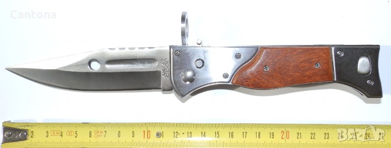 Армейски Сгъваем Автоматичн нож АК-47 СССР. Много добър сгъваем нож. Има всички стандартни елементи на класически щик - подпружинен бутон, канал в ръкохватка, (закрепване), напречници, канал по острието и др..