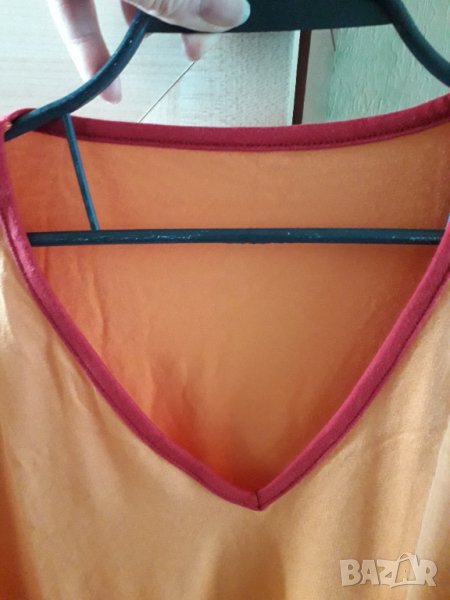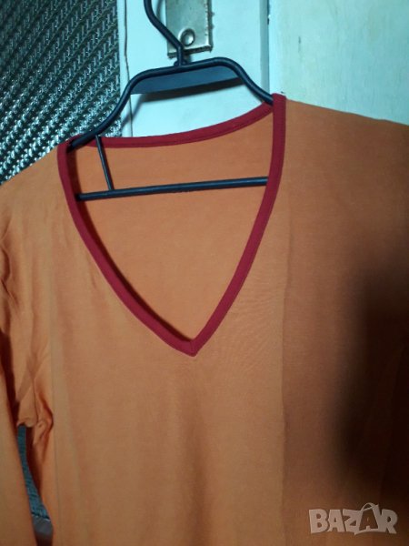 Оранжева блуза с дълъг ръкав с червено бие около триъгълно деколте, памучен трикотаж, размер среден М. Много мека финна материя. Блузата е нова. Изпращам с куриер с отстъпка, преглед и тест, или лично предаване в София.