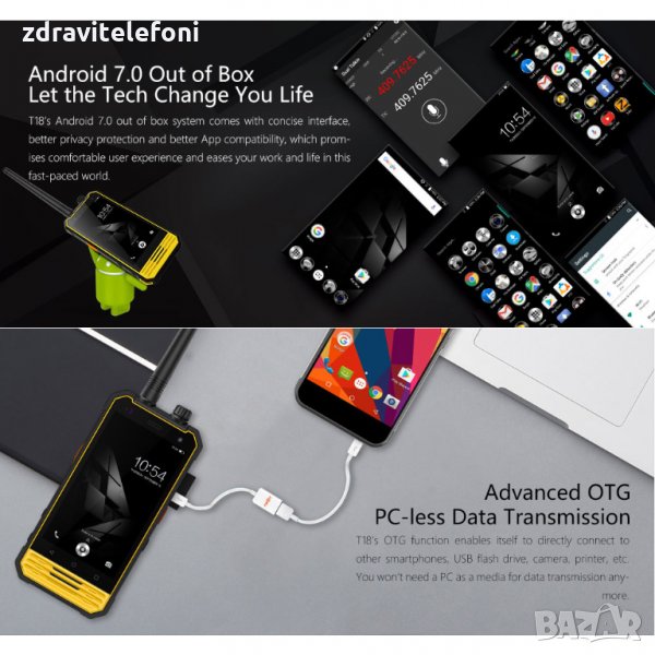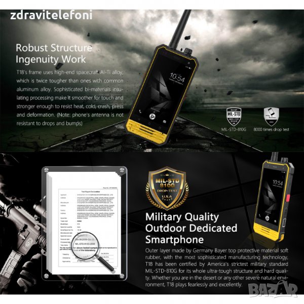рофесионален телефон! С професионална радиостанция,създаден да оцелее и при най сурови условия.Това е един телефон от най здравата гама на компанията който блести не с параметрите си а с пригодноста си за най сурови условия.Това е телефон за мисии и места с най суров климат! Мощна батерия и режим за запазване на батерията. Супер мощен сигнал на покритие и мощна 5Вата радиостанция със всички честоти.