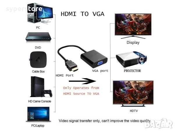Компактно проектираният преносим HDMI към VGA адаптер свързва компютър, настолен компютър, лаптоп или други устройства с HDMI порт към монитор, проектор, HDTV или други устройства с VGA порт; Приберете тази лека джаджа в чантата или джоба си, за да направите бизнес презентация с вашия лаптоп и проектор, или разширете екрана на работния плот до монитор или телевизор; Изисква се VGA кабел (продава се отделно)