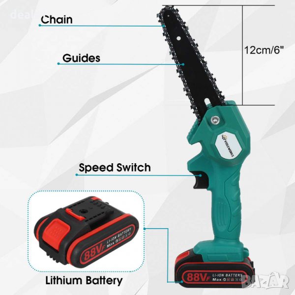 ● Акумулаторен електрически верижен трион, лек и преносим, дълъг живот на батерията, без повреди по кората.