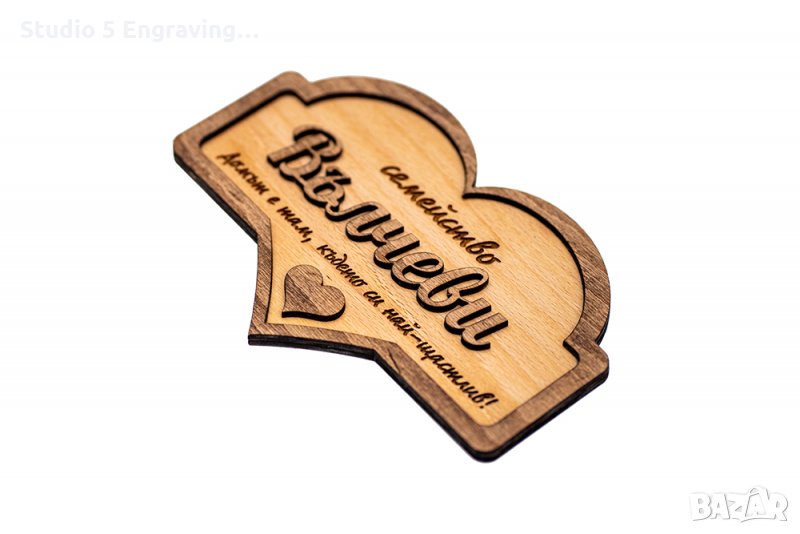 Гравирана табелка от дърво за входна врата под формата на сърце.