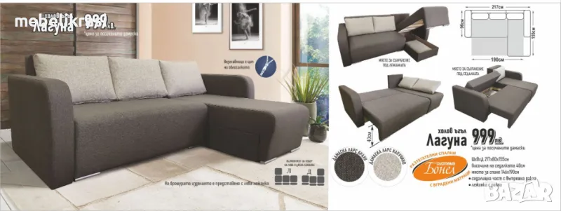 Холов ъгъл Лагуна се предлага в стилна цветова комбинация, която ще се съчетае с интериора на всеки дом. Ъгълът разполага с функция сън, която бързо и лесно го превръща в удобно легло. Ракла с амортисьорен механизъм.