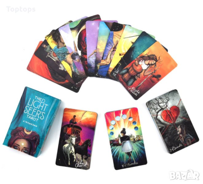 - 78 таро карти - Light Seers Tarot заедно с пдф файл с инструкции на английски. Размерът им е 10,3см х 6,5см, колодата е създадена от Chris-Anne.