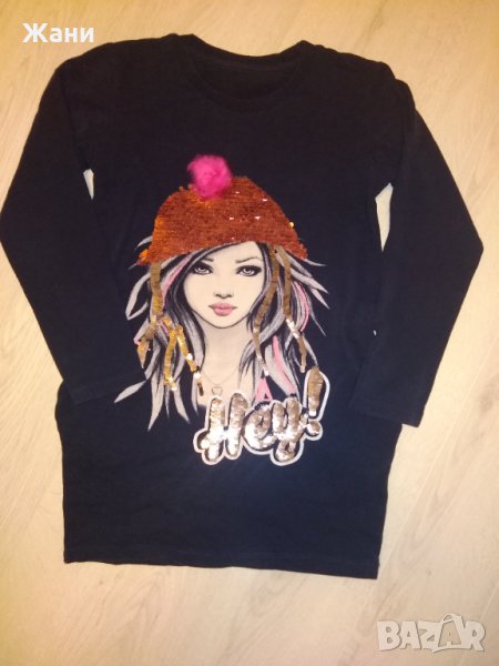 1.рокличка,туника-тъмносиня,плътна,с две джобчета,сменящи се паети.В отлично състояние.