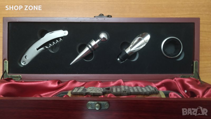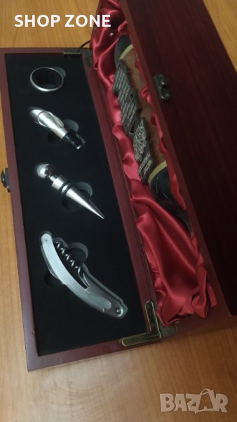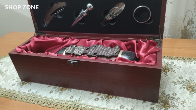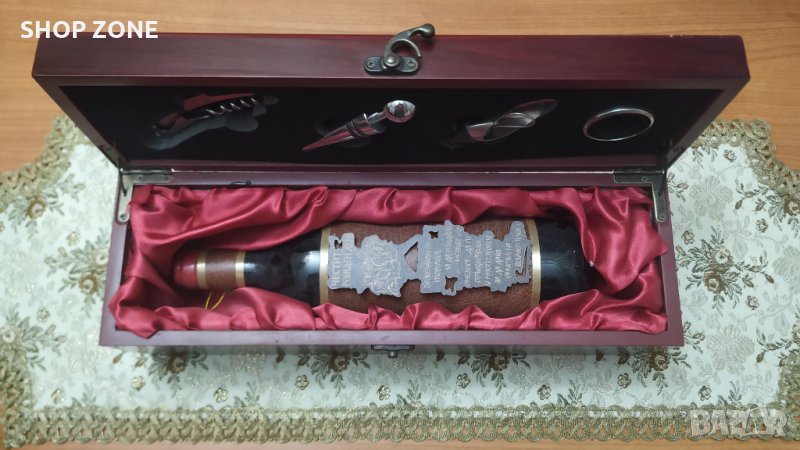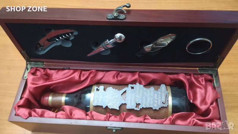 Предлагам много стилен, луксозен комплект вино с всички нужни аксесоари към него в голяма дървена кутия. Подходящ за подарък на Ваш приятел или роднина, който е запален по лова и дегустацията. Бутилката е с пожелание за рожден ден ден.