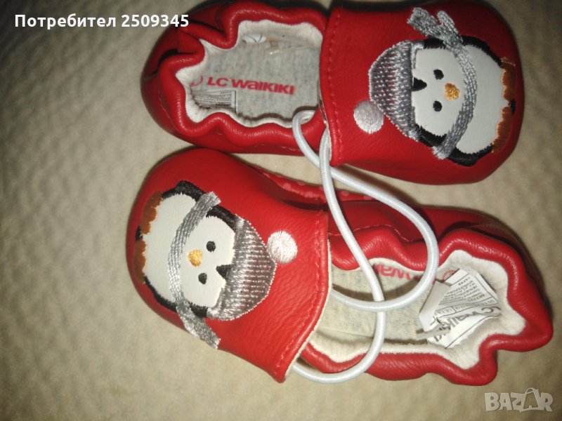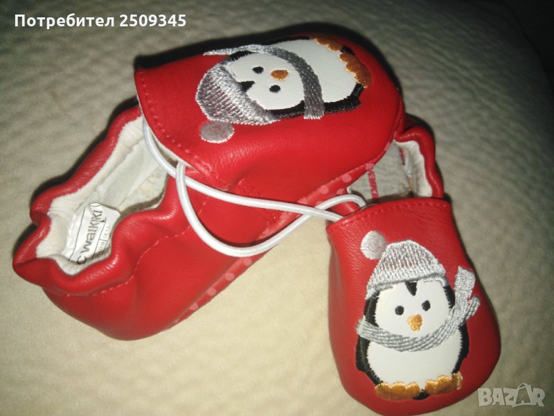 Бебешки пантофки номер 17/18,кожени, подметката има топченца да не се хлъзга детето, червени с пингвинче! Ново!