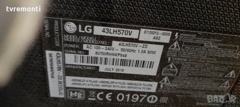 LG POWER SUPPLY 43LH570VEAX66851301(1.5) EAY64310501 борда е гарантирано работещ Демонтиран от телевизор LG модел 43LH570V със счупен дисплей HC430DUN-VAVX3-511X тествана от нашия техник