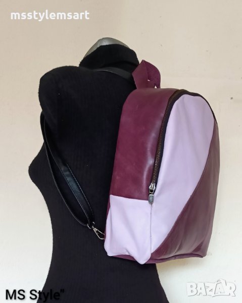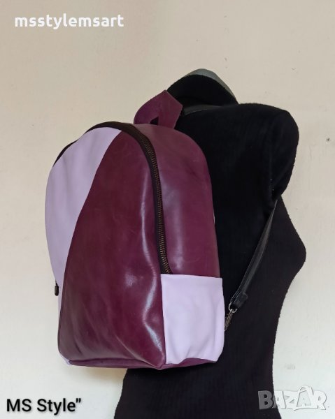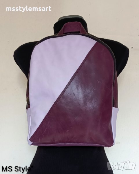 #Класически #модел, раницата е #ръчно #изработена от #качествена #естествена #кожа, в #комбинация от #два нюанса #лилав #цвят, с #едно #отделение закопчава се с #метален #цип, #подплата, с #два #вътрешни #джоба, с #дълга регулираща се #презрамка и #къса #дръжка за закачане.