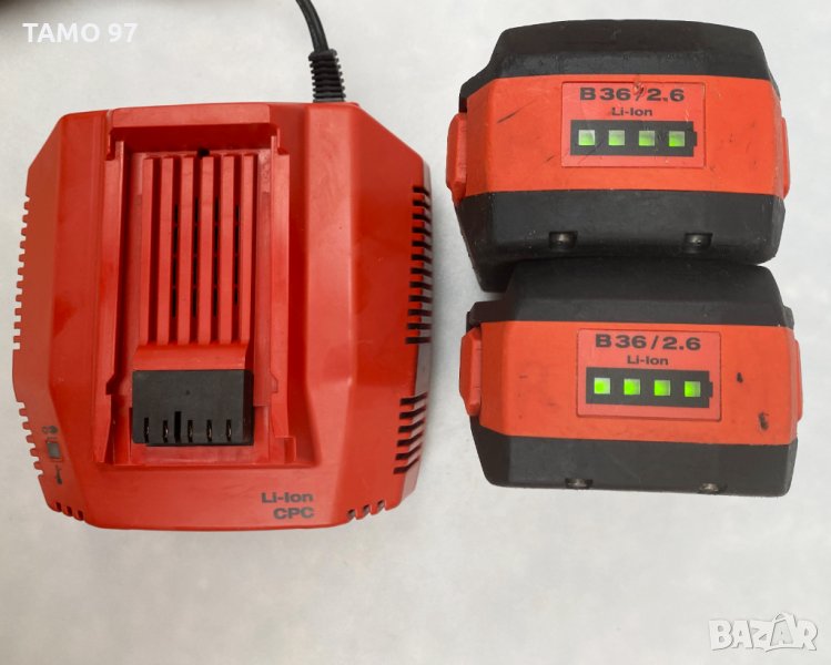 Хилти, комплекта има леки козметични забележки от употреба, но всичко си работи без проблем. Комплекта включва перфоратор, 2 батерии по 36V 2.6Ah с индикатор, бързо зарядно, грес на хилти и куфар.