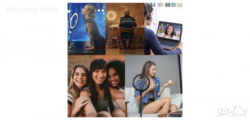 Съдържа статив, който лесно и здраво се адаптира към маса или земя. В долната част на основата на статива има нехлъзгаща се гума, така че не е нужно да се притеснявате за драскотини. Светлината на пръстена осветява кожата ви, без да заслепява очите и е идеална за излъчване на живо, грим, видео в You Tube или фотография. Стативът 24 см е сгъваем, компактен, лесен за съхранение, докато е лек и лесен за носене.