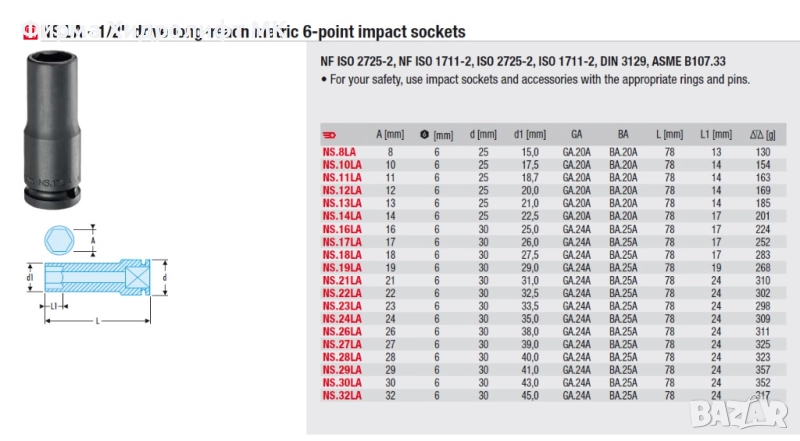 FACOM NS.LA Вложка 1/2" удължена усилена шестостенна - различни размери и цени