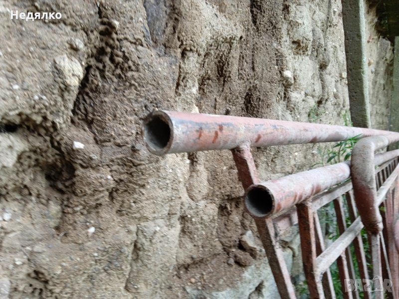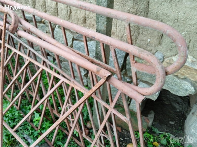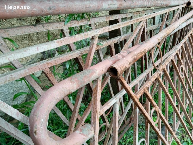 Всичко е ръчна изработка,стара изработка,ковано желязо ,квадрати 1,5 см и 2 см,тръбите са 3 мм дебелостенни,вечния материал,не като съвременните ментаци,6 елемента, 2 броя по 3,30 метра дължина,3 броя по 1,65 м и 1 брой 1,35 м.Тежки и масивни,може би около 200-250кг.Оградата е за стълбище, под ъгъл,не е за двор!