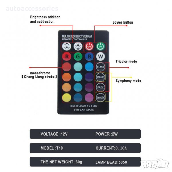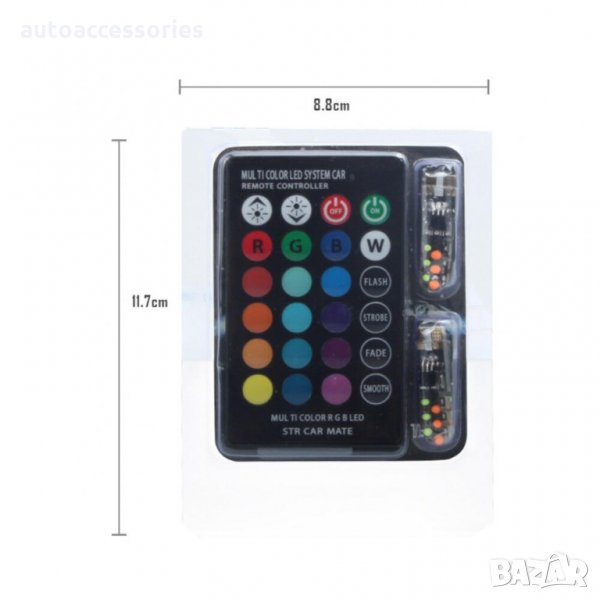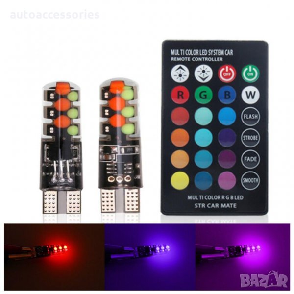 2бр. T10 RGB Маркови светлини за автомобили LED светлина 12SMD COB с дистанционно управление