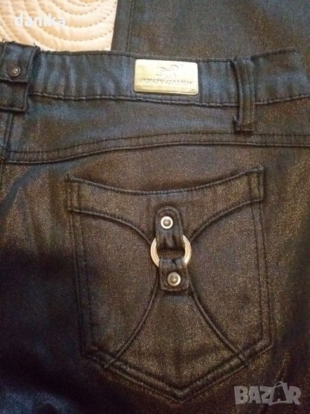 Дамски панталон с дискретен блясък . Прав крачол имитира дънки . Размер М . Лека еластичност .