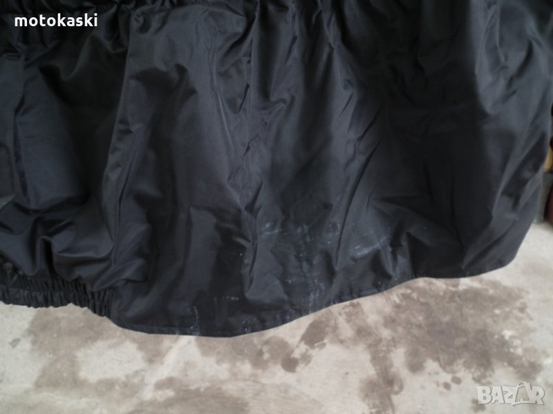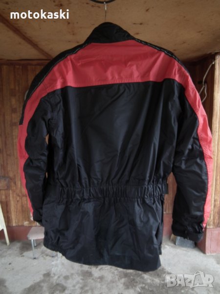 Мото яке за дъжд Professional, протектори на гръб, лакът и рамо, размер L, дължина отзад 80 см., обиколка около 126, гръб 56, ръкав отгоре 64 и отдолу 52, има цип за скачване с панталон и няколко петънца най-отдолу отзад, които се махат с влажен парцал, така че иска още малко почистване, цена: 109 лв.