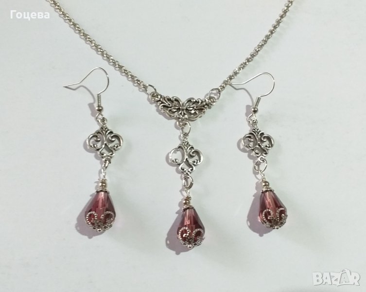 Прелестен комплект бижута с кристали в цвят бургунди и изящна орнаментирана основа в цвят Сребро → Обява 34466633