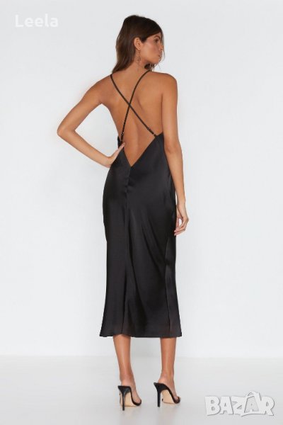Миди рокля Nasty Gal от черен сатен, с триъгълно деколте, дълбоко изрязан гръб с Х-образни регулиращи се презрамки, и елегантна дължина до прасеца.