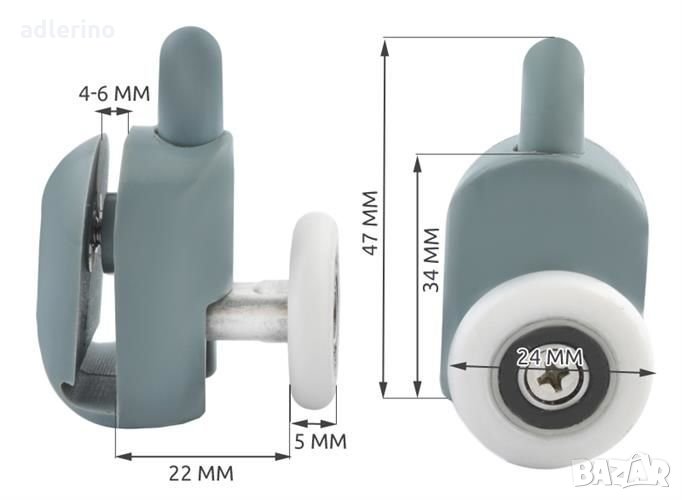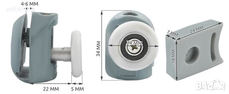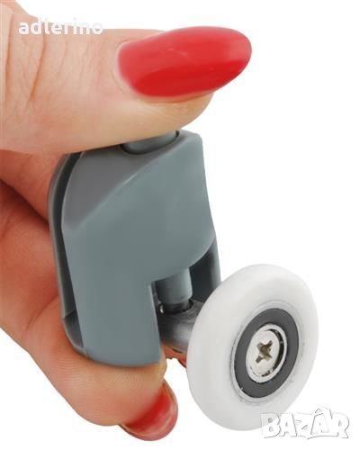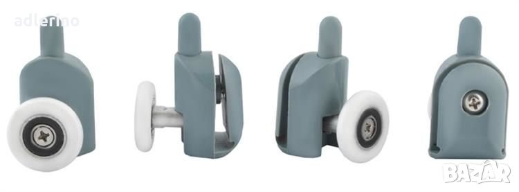 Комплект горни и долни ролки за душ кабина заедно с капачки и брони. Горната ролка има регулируем приставен елемент. Ролките са монтирани на лагери, подходящи са за стъкло с дебелина 4-6 мм, прилягат на различни видове душ кабини.