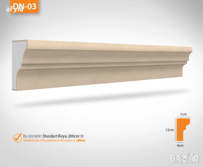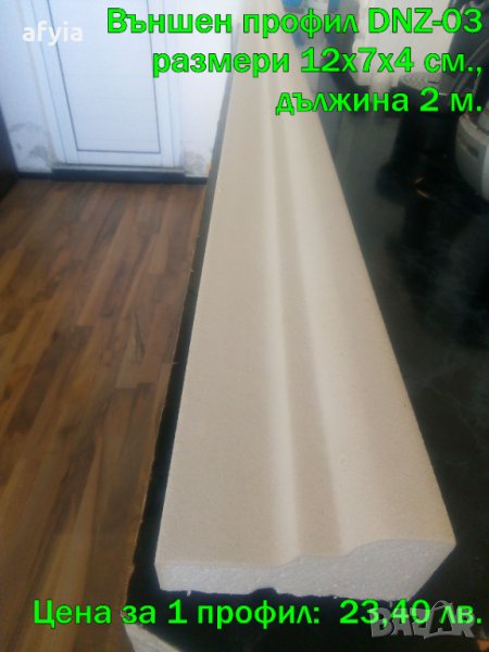 Изработени от плътен пенополистирол с машинно покритие от кварцов пясък и полимерни смоли. Устойчиви на всички атмосферни условия, водоустойчиви и удароустойчиви. Лесно се режат с трион за дърво. Снадките се запълват с фугин, който предлагаме. След монтаж профилите се минават с дълбокопроникващ грунд и се боядисват с фасадна боя.