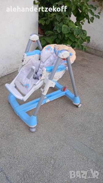 Столчето е най - висок клас, с алуминиева конструкция и е италианско , таблата за хранене липсва за това и цената е такава . Има възможност за регулиране на височината на таблата за хранене, дълбочината на таблата и отстраняването и. Може да се регулира височината на седалището и наклона на облегалката. Столчето е с колелца със стопери и може да се придвижва с лекота, а сгънато е много компактно. Ново струваше 200лв, цената може да се коментира.