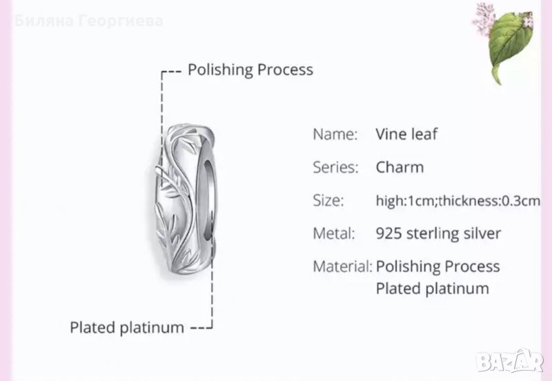 Талисман разделител за гривна Пандора Vine Leaf s925 модел 017 → Обява 34480074