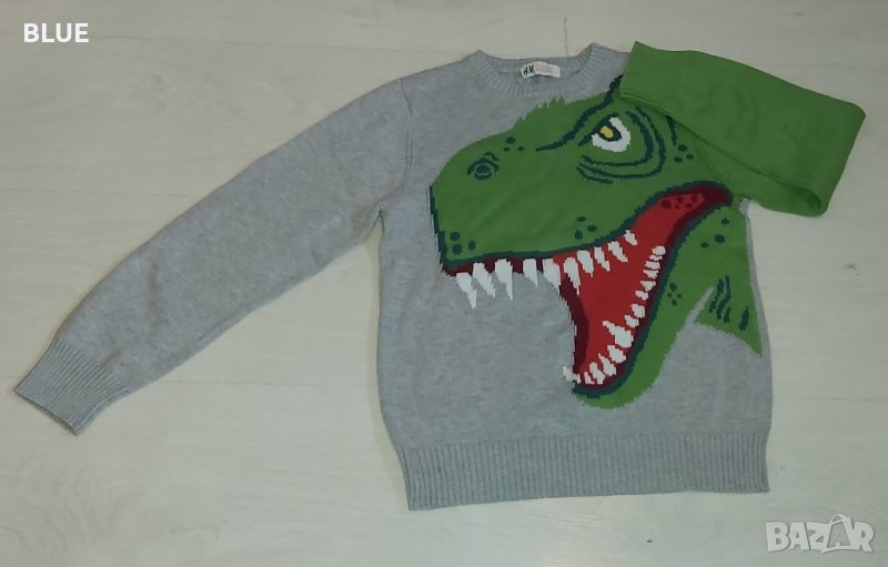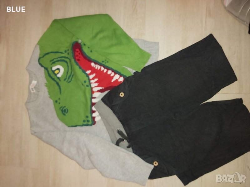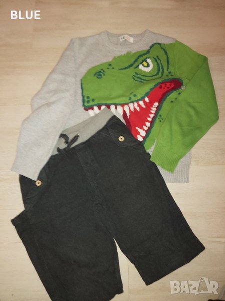 Марково панталонче и пуловер с динозавър. Отлични са, без забележки. Панталон:Дължина 77см. От чатала 60см.Талия на л;астик с връзки 29 до 34см. Пуловер:Дължина 50см. Ширина 37-38см.