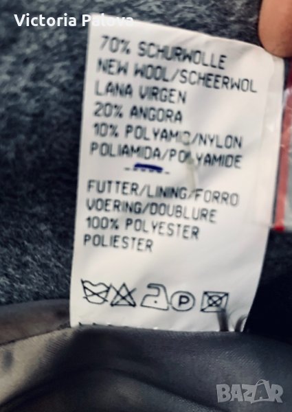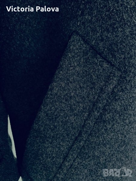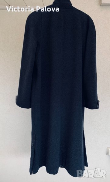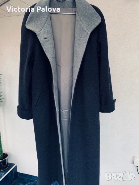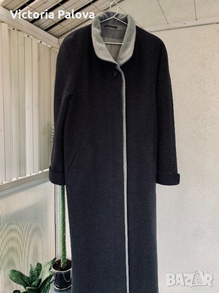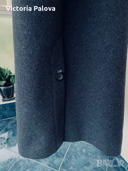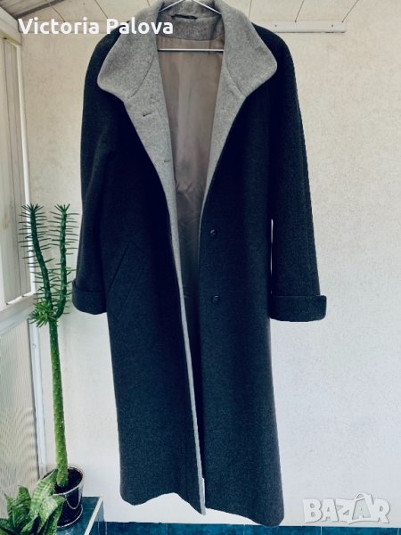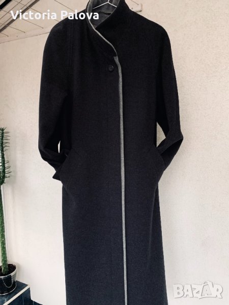 Прекрасно стилно палто тъмносив цвят, модерна кройка - почти право, ГО-60см, талия-60см, надолу малко (4-5см) се разширява, почти незабележимо. ръкавът е полуреглан, от мишницата е 43см. дължината е 120-121см. палтото е с точни линии, държи форма, материята е божествена, детайлите (тегели, джобове, шлиц от двете страни, светлосивата вставка) са впечатляващи.