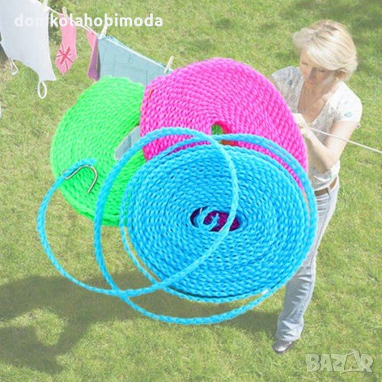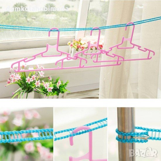 Практично преносимо въже за простиране, което може да използвате у дома, на двора, по време на къмпинг, ваканции и др. То е изработено от здрава и устойчива нишка, а малките примки са идеални за поставяне на закачалки.