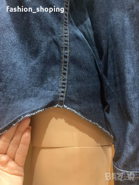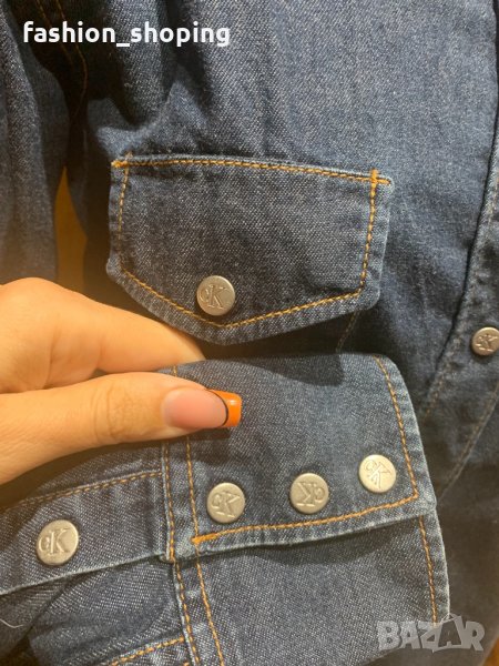 Дамска риза деним на Calvin Klein Jeans. Денимът е тъмен и подходящ за по- хладните месеци. Универсална дреха, която може да се комбинира еднакво успешно като част от по- спортен или елегантен стил. В съчетание с пола, обувки на висок ток и красиво колие стои страхотно. С кецове и дънки става елемент от класическа спортна визия. Спокойно може да се нарече “must have” за всеки женски гардероб. Съставът е 100 % памук. Брандирани копчета тик- так навсякъде- по цялата дължина на закопчаването, на джобовете и в долната част на ръкавите. На лявото джобче има интересен детайл- малък отвор за слагане на химикал( на предпоследната снимка).