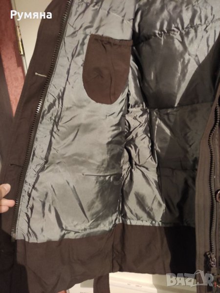 Цветът е кафяв, има колан, двоен цип, множество вътрешни джобове, яката е от заек, сваля се, на гърба има светлоотразителна лента.