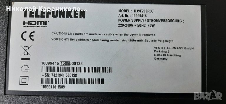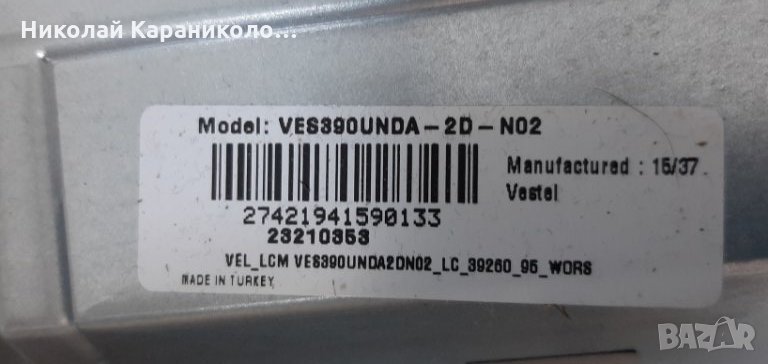 Продавам тв TELEFUNKEN D39F265R3C за части по причина-дефектирала матрица/VES390UNDA-2D-N02/.Редовни съответно: