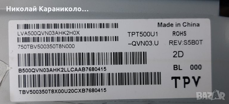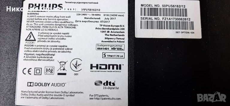 Продавам тв PHILIPS 50PUS6162/12 за части по причина - счупена матрица/TPT500U1-QVN03.U REV S5BOT/.Редовни съответно: