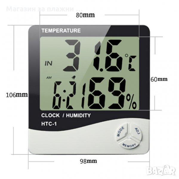Метеостанция HTC-1 - Термометър за вътрешна и външна температура, влагомер, часовник
