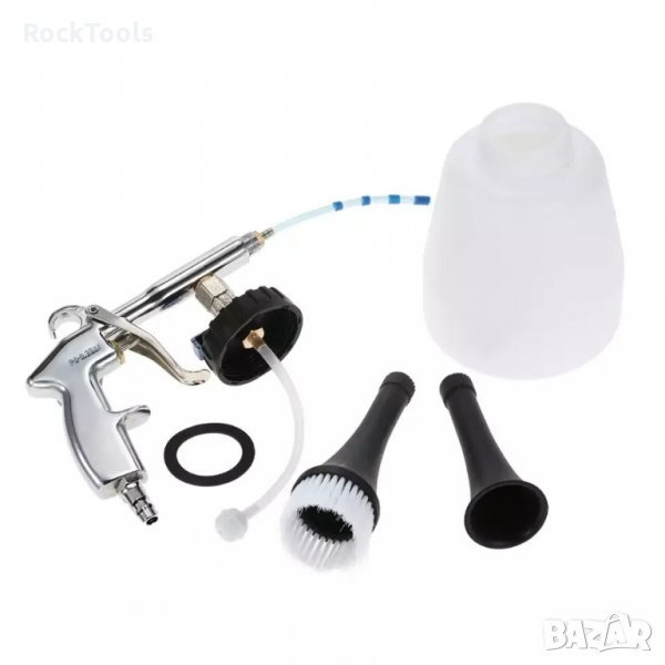 Уникална система(Немски пистолет) за вътрешно почистване и пране, особено подходяща за почистване на автомобили. Свързва се към компресор и благодарение на налягането, въздуха и препарата се завихрят като мини торнадо и изваждат мърсотията от порите. Нужно е само да забършите с влажна кърпа. Работи с различни типове препарати според мястото, което третирате. Изключително подходящ за пране и почистване на автомобилни интериорни пластмаси, кожа и текстил.