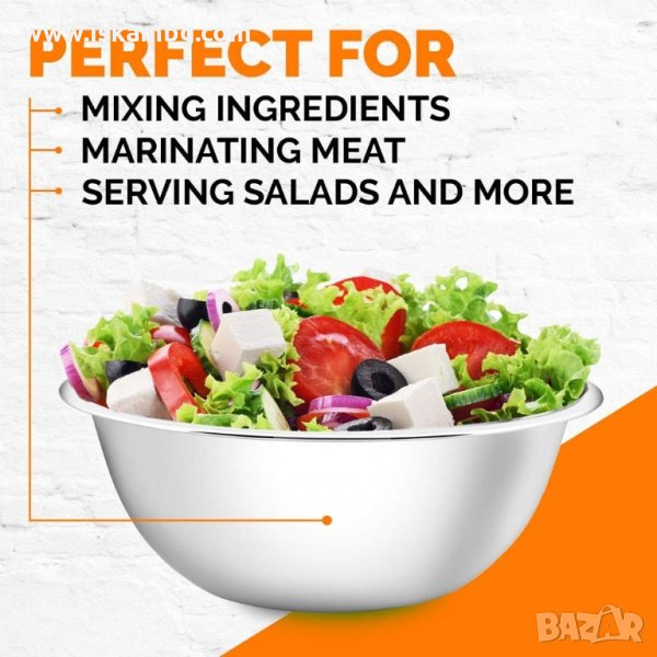 Голяма метална купа, идеална за разбъркване, разбиване и замесване на тесто. В нея можете да приготвите и поднесете свежа салата, плодове или хляб. Подходяща за съхранение на продукти в хладилника, ако ѝ сложите капак.