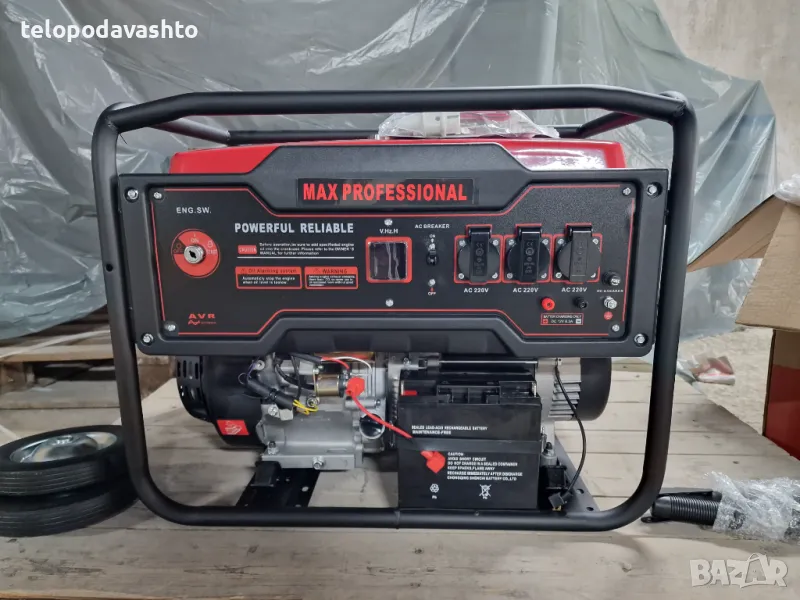 Новите 7.5 KW бензинови четиритактови генератори Max Professional за монофазен ток. ВГРАДЕНО АВТОМАТИЧНО ЗАРЯДНО ЗА АКУМУЛАТОРА. При нашите генератори автоматичното старт-стоп табло следи за нивото на заряд на акумулатора и при нужда го дозарежда до нужния заряд, за да може всеки път генератора да стартира безупречно. Когато генератора не е превключен на режим автоматика, паленето на генератора е с ключ, който е на управляващото табло. Генераторите са с медни ротори и статори. Бензинов Двигател VТR 800 с въздушно охлаждане, 18 конски сили. Работна честота: 50 Hz. Вграден AVR /Automatic Voltage Regullator/. Автоматичен предпазител против претоварване на генератора. Магнетен стартер и автостартер с ключ и акумулатор. Транспортна рамка с колела и дръжки за по-лесно предвижване на генератора. Генератора има вграден дигитален дисплей показващ изходящият моментен волтаж, херцовете и отработените моточасове. 3 броя изходи за 230 V и един изход за 12 V. Нивото на шума е 69-72 dB. Разход: 450 грама бензин на киловат час при пълно натоварване. Размерите му са: дължина 68 см., ширина 51 см. и височина 55 см. Тегло бруто с автоматиката 110 кг. Гаранционен и след гаранционен сервиз.