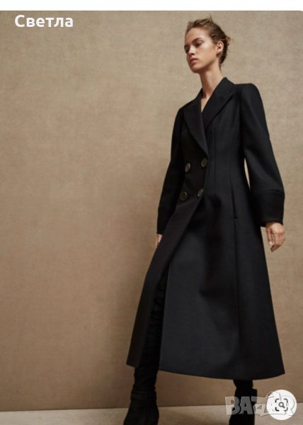 Стои много елегантно. Размер 40 български, отговаря на S. Състав : вълна 60 %, кашмир 10 %, полиестер 30 %, подплата 100 % вискоза. Няма следа от употреба, като ново е. На снимката манекенката е с друго палто - подобно, но това стои по идентичен начин и дава представа.