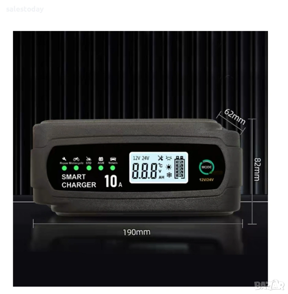 зарядно устройство за акумулатори, подходящо за автомобили, мотоциклети, камиони и други превозни средства. Работи с различни типове акумулатори – AGM, GEL и стандартни оловно-киселинни (STD), като осигурява надеждно и безопасно зареждане.