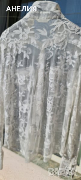 Оригинална, ефектна, полупрозрачна спортно - елегантна дамска риза с копчета тик-так, джобове, дълъг ръкав, състав - тюл и памучна бродерия, р-р L, ОГ-120см, Д-65см.