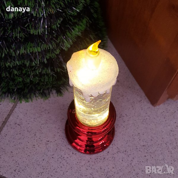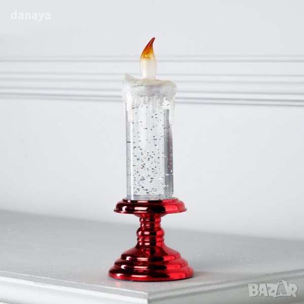 Красива електронна коледна свещ с LED светлина. Вътрешността е с прозрачна течност, в която има множество бляскави частици. Прекрасна коледна декорация. Предлага се в кутия. Подходяща за подарък. Работи с 2 ААА батерии, които не са включени в комплекта.