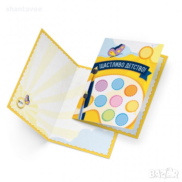 На лицевата част от картичката има нарисувана палитра с 9 кръгли боички.